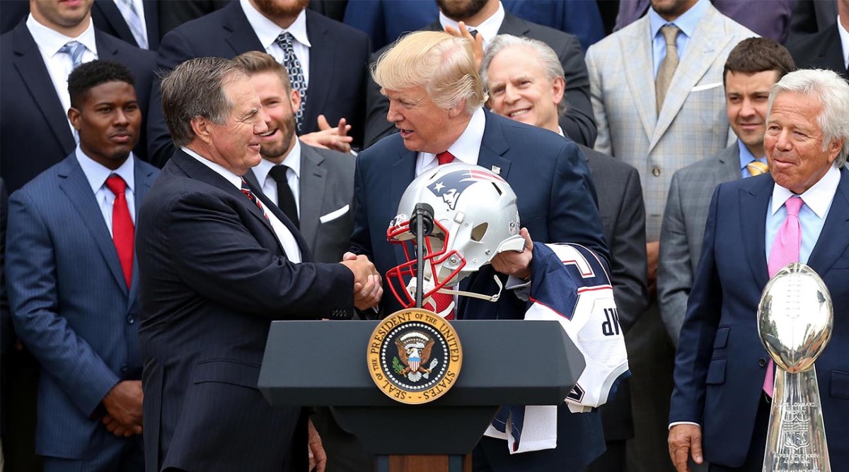 When Trump hosted Belichick and the Patriots in April 2017, shortly after New England won Super Bowl LI over the Falcons, New England presented Trump a personalized Super Bowl ring.
